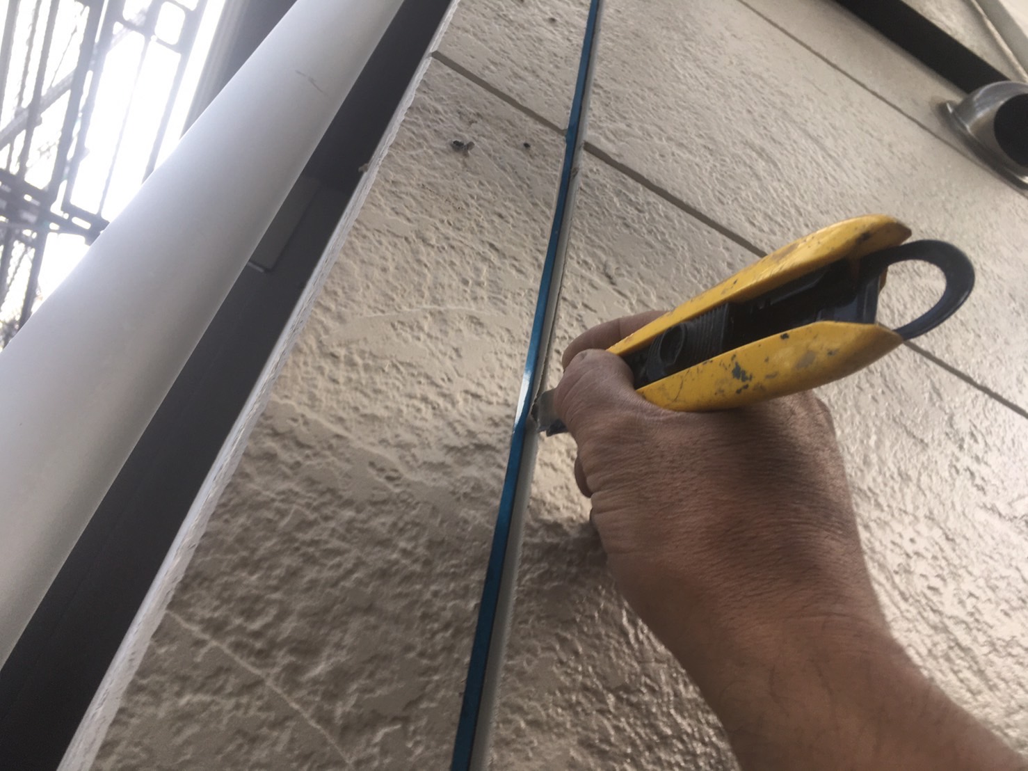 カッターを使用し、サイディングのボードを傷つけないよう慎重に、かつ徹底的に古いゴムを削ぎ落とします。