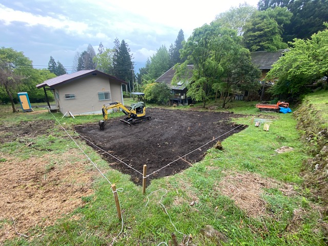 重機を使って大きな凹凸をなくし、基礎を安定させるための下準備を行いました。