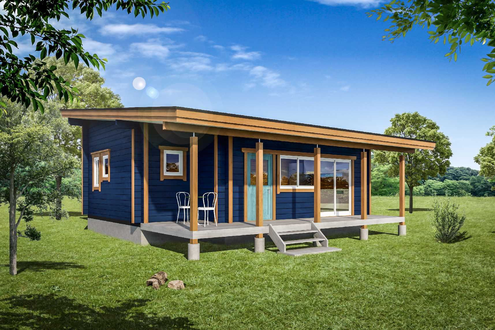 - 外観:ネイビーブルー×木目のコントラストが印象的