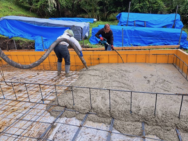 配筋が完了したら、いよいよコンクリートの流し込み(打設)に入ります。