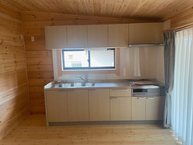 ログハウス内装 クリナップ ラクエラ キッチン設置事例